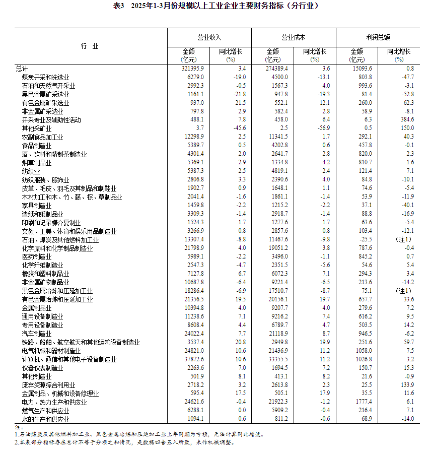 1—3月份,主要行业利润情况如下:农副食品加工业利润同比增长40.3%,有色金属冶炼和压延加工业增长33.6%,专用设备制造业增长14.2%,通用设备制造业增长9.5%,电气机械和器材制造业增长7.5%,纺织业增长7.1%,电力、热力生产和供应业增长6.1%,计算机、通信和其他电子设备制造业增长3.2%,化学原料和化学制品制造业下降0.4%,石油和天然气开采业下降3.1%,汽车制造业下降6.2%,非金属矿物制品业下降14.2%,煤炭开采和洗选业下降47.7%,石油煤炭及其他燃料加工业同比减亏,黑色金属冶炼和压延加工业同比由亏转盈。