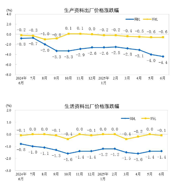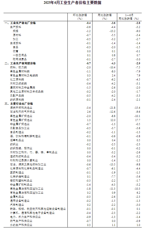 2025年6月份,全国工业生产者出厂价格同比下降3.6%,环比下降0.4%;工业生产者购进价格同比下降4.3%,环比下降0.7%。上半年,工业生产者出厂价格比上年同期下降2.8%,工业生产者购进价格下降2.9%。