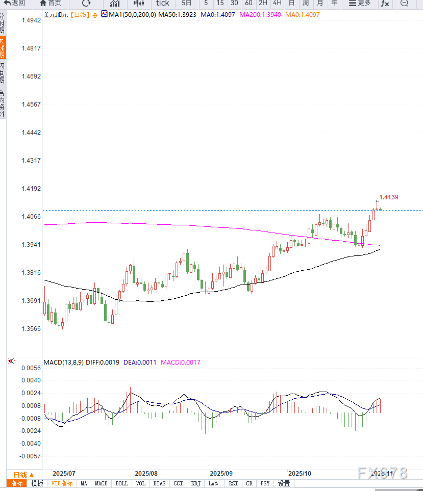 基本面来看,加拿大央行上周宣布连续第二次降息25个基点至2.25%,为2022 年以来最低水平。行长 Tiff Macklem 表示,如果经济前景恶化,央行仍准备采取进一步措施,这意味着政策仍偏向宽松。 美国方面,最新就业数据对美元形成支撑。ADP 报告显示,美国10月私营部门就业增加42,000人,不仅好于市场预期25,000人,也显著扭转前值下降态势。 尽管就业数据向好,美联储主席鲍威尔强调,12 月是否降息尚不确定。CME FedWatch 显示,市场对12月降息可能性的押注已从93%降至 约70%。 油价反弹叠加美联储降息预期降温,使美元失去部分动能,为加元反弹提供空间。 从日线结构来看,USD/CAD 在1.4160–1.4200 区域形成双重压力区,该区域对应布林带上轨与阶段性高点重叠,价格在5连涨后出现明显动能衰竭,RSI 指标从超买区回落。 短期支撑位位于 1.4040–1.4000 区间,若跌破,则将打开进一步回调空间至 1.3920(20日均线附近)。整体趋势仍保持上升结构未破坏,但当前处于上涨后的技术性修正阶段。 ??