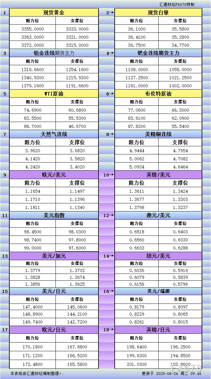 一张图看商品支撑阻力:金银油气+铂钯铜+农产品期货,更新于2025年6月23日周一13:30,具...