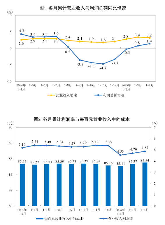 1—4月份,全国规模以上工业企业实现利润总额21170.2亿元,同比增长1.4%(按可比口径...